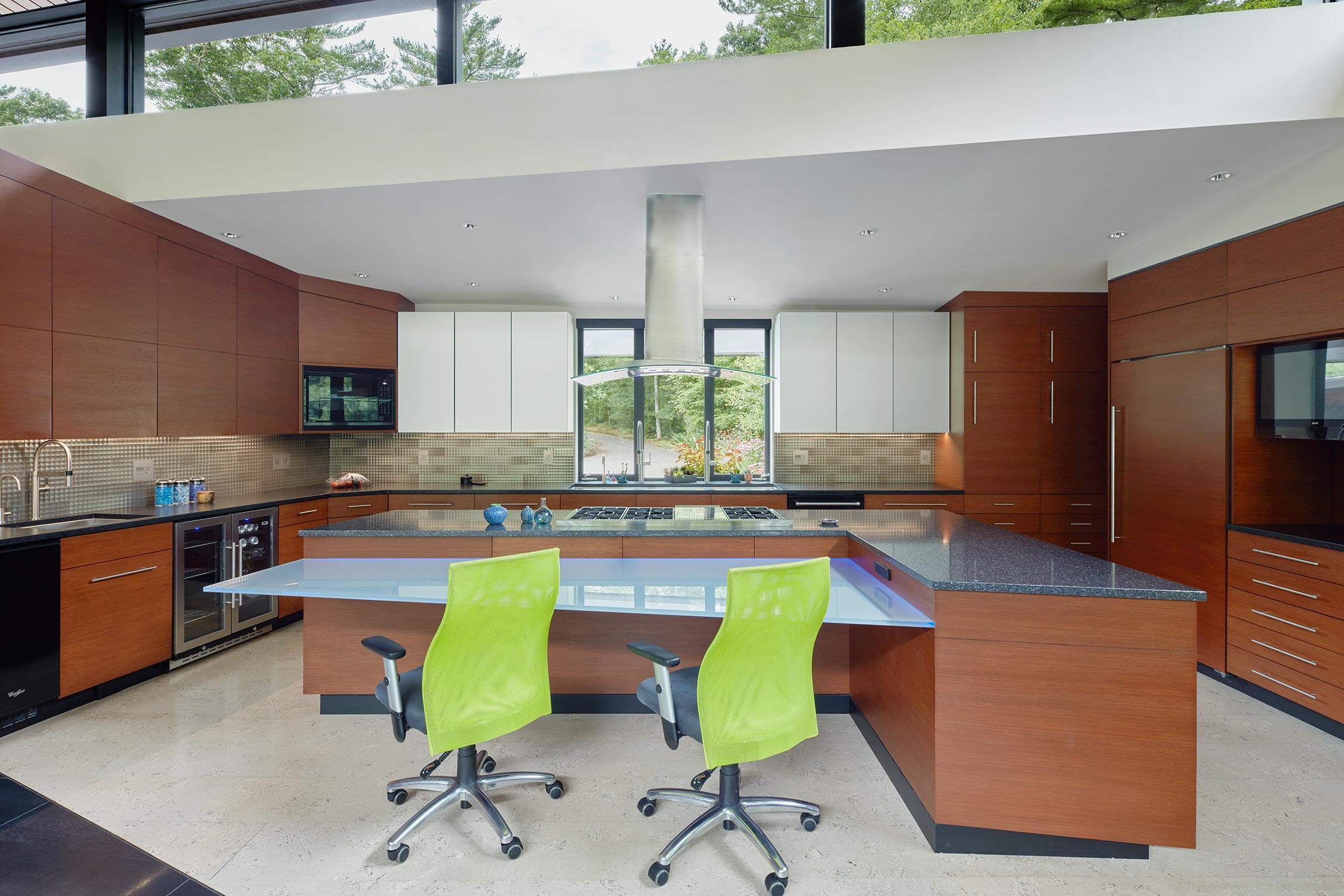 The kitchen sits beneath a lowered ceiling accented by clerestories, bringing soft daylight from above. A long galley sink with dual faucets overlooks the entry court and garden, while the island and seating counter support cooking, conversation, and gathering.